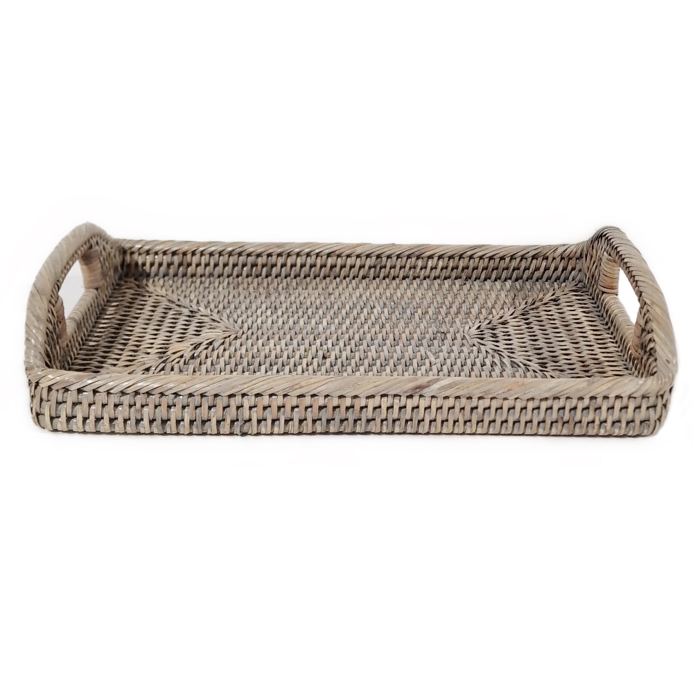 Beautifully made small oblong rattan serving tray, finely woven from rattan core and woven rattan peel. The soft grey finish gives it a contemporary feel.