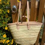 A full shoulder French market basket with flat natural handles & a half shoulder basket with rolled natural leather handles.